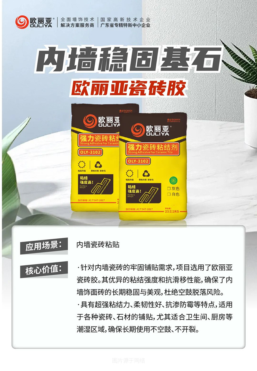 東莞市歐麗亞環(huán)保材料有限公司專注于“環(huán)保,創(chuàng)新”型建筑裝飾材料,瓷磚膠,硅藻泥,石材防水背膠,抗裂砂漿,裝飾砂漿,防水系列,自流平水泥,防霉膩?zhàn)樱弦惶羁p劑的研發(fā)、生產(chǎn)、營(yíng)銷、技術(shù)咨詢于一體的墻飾高新技術(shù)企業(yè)。